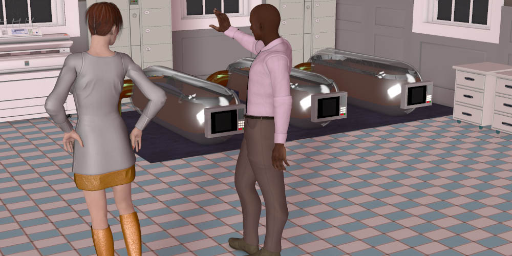 Barry: Yeah, they're like the fourth generation of our third prototype. They work just fine, really. We've tweaked the bio-monitoring mechanism quite a bit since these, so the new models, like the one you saw, allow a patient to get right in without any special preparations. Luxana: Really, what kind of special preparations do they have to do here? Barry: These units get confused by clothing and dry skin reduces their accuracy. So our subjects take a quick shower using a mild disinfectant soap. The dampness is what we really need, the soap's mostly to put their minds at ease about sleeping naked on a bed that gets, you know, "used" by other people. At The Center they can wear pajamas and don't have to shower. The biometrics are better there.