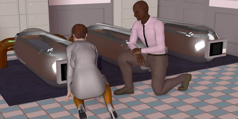 Barry: You got that right, thank goodness we're doing studies on just women! (Chuckles) A sense of humor does help around here. Luxana: So Barry, tell me about what studies are going on here lately. Barry: We have two running in parallel at the moment. I design and oversee them, but I don't have time to administer them both, so one of our interns, Simon, takes care of the other. I'm trying to make gender related adjustments to our biometric measurement methods on mine, and on Simon's we're testing slight changes in the brain mapping, again looking to differentiate them from the men's. We're trying to uncover gender-specific differences in the treatment that might account for our lower effectiveness with female patients.