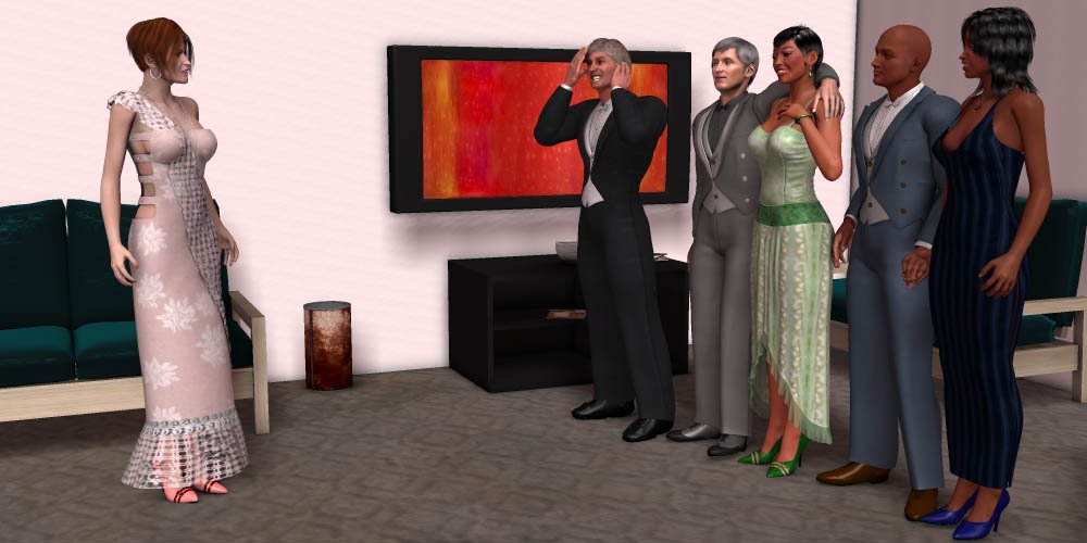 Luxana: What about my feet? Zachary: ...and you've got your feet in high heels too, not to mention you are wearing the HELL out of that dress! Ha! Hold my brain. Be still my beating heart. Luxana: Zach you look positively debonair! Hey everybody. You must be Justine; your father told me all about you. He calls you his whole world. Justine: Really? Nice Dad, that's nice. Luxana: I put my mother in the limo already. Now let's see if I can get over there in this dress without falling on my butt. |